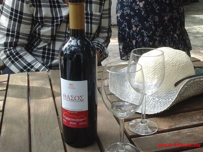 Nikos úr nagy büszkén vette elő nekünk a száraz vörösborát. A címkének nagyon megörültünk. Írja : Thassos ...