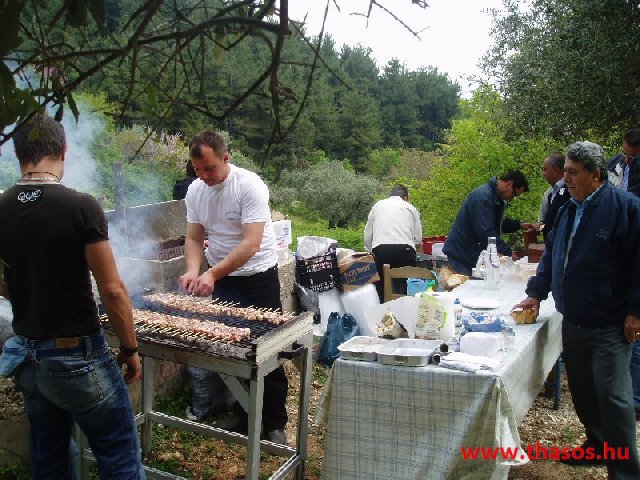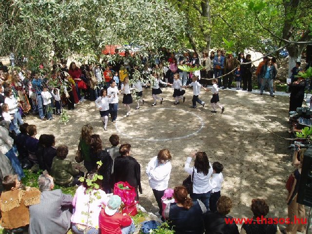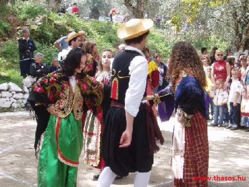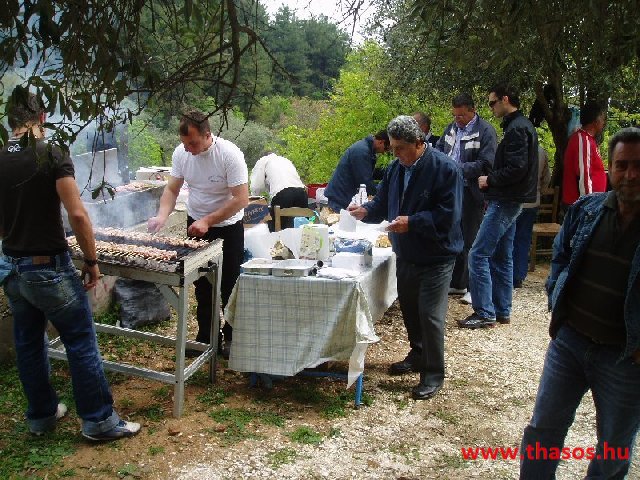 A liturgia után a Metoxi kolostor udvarán felállították magnójukat. Egy flekkenezőt is oda tettek. Ki sütött, ki rögtön táncolt is. Majd jöttek a falu többi emberei is, és évről évre hozzátett valamit e szép hagyományhoz. Kora reggel kezdődik a liturgia, mely kb. 11.00 órakor ér véget az egyházi étel szétosztásával az előző nap böjtölő emberek közt. A bárányos étel után kezdődik a közös mulatság. Talán a régi magyar május elsejére emlékeztető a kép és a hangulat. A sziget összes lakója itt van ezen a napon. A hegyoldalban sátrak, flekkenezők. Ki-ki készül egy kis csemegével az egész napos mulatságra. Megy a népi tánc, örül mindenki és a társaságok köszöntik egymást. A nép oly nagy hanggal van, hogy a szintén hangos forrás csobogását csak az hallja, ki szomját oltani a kúthoz megy.