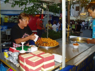 A bejáratnál egy Euróért árulták az illatos suflakikat, ami a húsíllatú füstfelhőivel hosszú kigyózó sort verbuvált össze. Így csak furakodva tudtunk bemenni a főbejáraton. Akadályt képezett számunkra a bejáratban teherautóról árusító emberke is. Termékei a mindenféle fából készült konyhai eszközök. Kiabálás, turkálók, alkudozók hangja nyomta el az udvarról a mikrofonba beszélő előadó hangját. A bejárat közvetlen következő árusa a mézes fánkos volt. 3 euróért vesztegették. Ide is túródtak a duci és csinos testalkatúak egyaránt. A következő, a lukumi árus Limenária-Potosból volt. Itt nyalakodtunk. Mézes-diós, menta, rózsaszirom, meggy, mandarin likőrökből, konyakból, mézes pálinkából. Házilag készítik e 18-20 % alkoholfokú, gusztusosan kiszerelt szeszesitalokat.