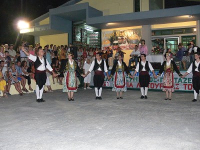 A kavalai népitánc csoport kezdte. Gyönyörű népi ruhákban. 8 férfi és 8 nő. Vegyes korosztályban, de inkább idősebbek. Méltóságteljes lépésekkel, gyönyörű mozdulatokkal táncolva. Bemutatták egy-egy táncban a teljes görög térség összes táncát. Ez a programrész kb. 1 órás volt. Megszakítás nélkül. Élőzenével, egy híres népdalénekesnő számonkénti felkonferálásával. Számomra új volt a Mitilini tűztánca. Ezt a nők egy egy olívamécsessel a kezükben, hastánchoz hasonló kigyózó mozdulatokkal adták elő. Lenyűgöző volt. De a férfiak tánca szintén ámulatba ejtett. A férfiak részéről legkülönlegesebb a kálimnói szivacshalászok tánca volt. Télen, amikor lehetőségem van dokumentumfilmeket nézni, szeretettel vadászok azokra a programokra, amelyek a néphagyományokat mutatják be. Egyszer ennek a táncnak az eredetéről láttam-hallottam történetet. Mi ez a különleges tánc, mi a története? A szivacshalászat annak idején életveszélyes foglalkozás volt. A mázsás fém búvárfelszerelésben merültek. Sokan életüket is vesztették. Sokan csak örökre nyomorékok maradtak. De a közösség továbbra is megbecsült tagjaiként részt vettek lebénulva is a mindennapi életükben. Egy-egy nagyobb sikeres búvárkodás után örömünnepekkel-tánccal ünnepelték meg a munkások hazatértét. Az ünnepen részt vettek ezek a már nem munkabíró egykori szivacshalászok is. Őket is odaültették a táncosok közé. Ők bottal a kezükben, a bot remegtetésével próbáltak béna testrészüket is bemozgatni. Időnként a tánc élményének átélése annyi erőt is adott nekik, hogy botra támaszkodva felemelkedtek, megpróbálva betáncolni a többiek közé. Majd elestek. Majd felemelkedtek. Ez volt az ő táncuk. Ennek élethű előadása igen megrázó élmény. A kavalai táncosok remek átéléssel adták elő ezt a táncot is.