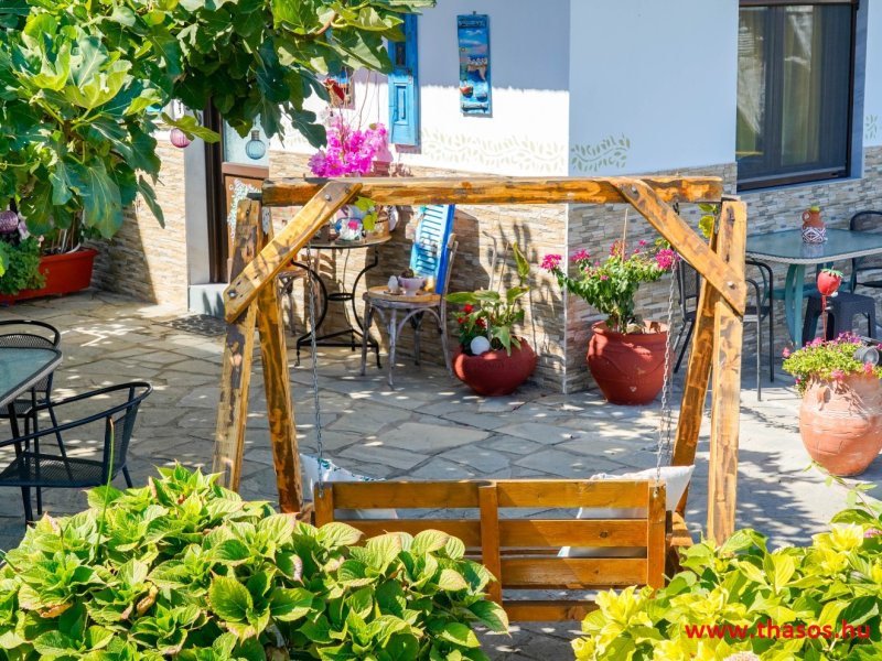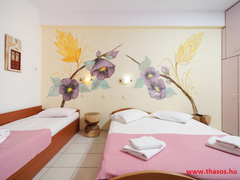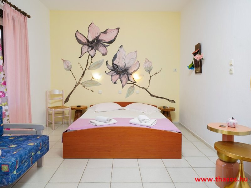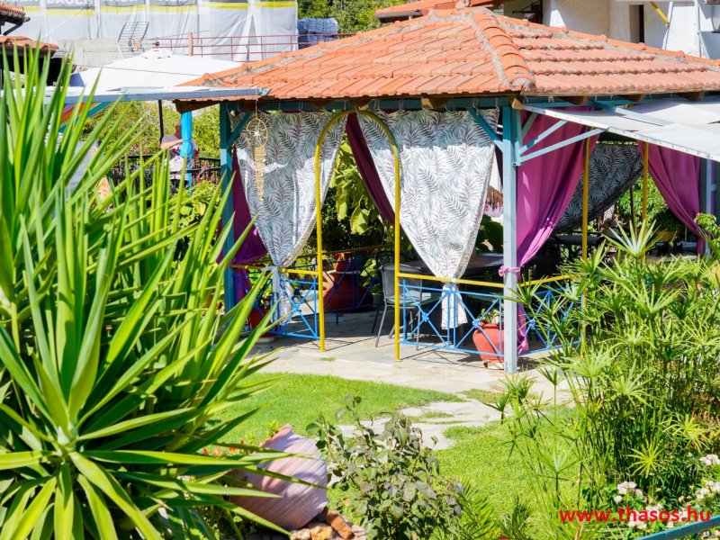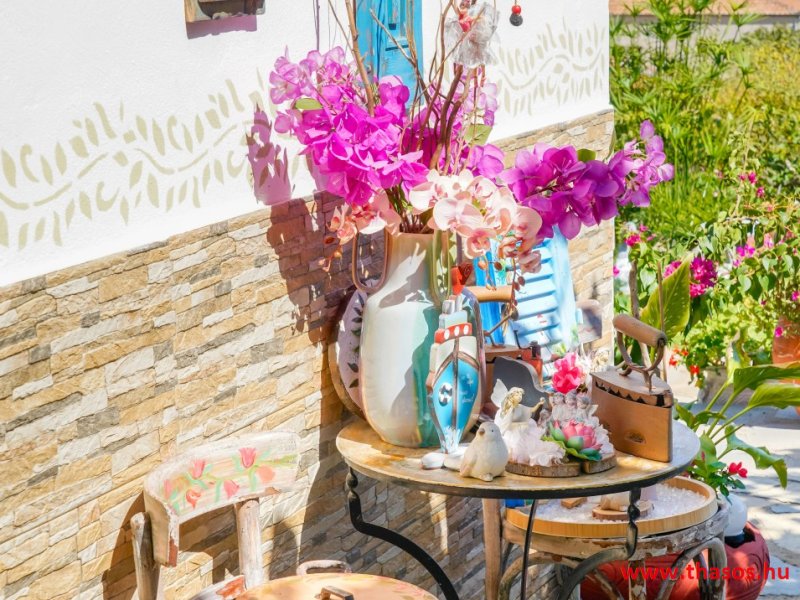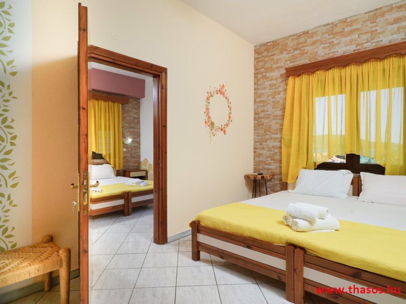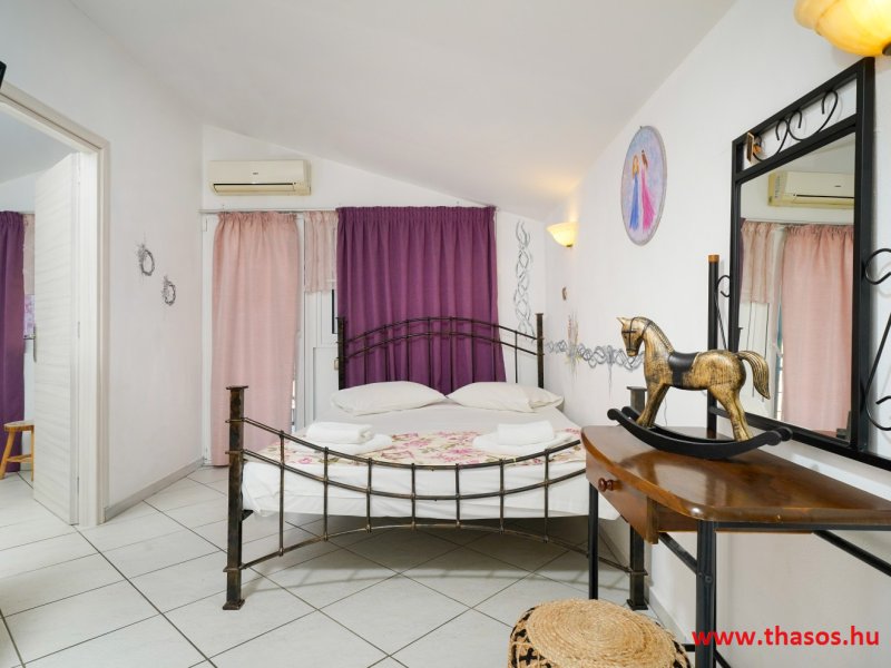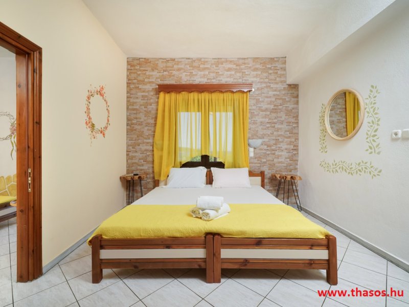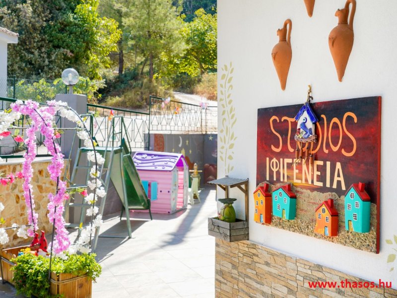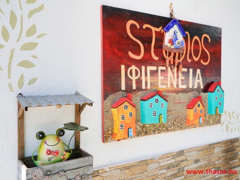Az Ifigénia butikapartman ideális úti cél azok számára, akik nyugodt nyaralásra, minőségi pihenésre vágynak, újra kapcsolatba akarnak kerülni a természettel, és egyedi szálláslehetőséget keresnek. Az apartmankomplexum egy építész mérnök háza. A telket megemelve arra törekedett, hogy pazar tengeri kilátás legyen az öbölre. Az ház belső lakásai szintén belső építész alakította ki. A lakások elnevezése ezek miatt, inspirációként a görög mitológiát és a kilenc múzsát, a művészetek és a tudományok különböző területeivel kapcsolatos istennőket választva. Az egész ház egy csodálatos varázs. A ház helyzete szintén remek. egy lélegzetre a színes forgatagos turista sétánytól, ahova az egész szigetről érkeznek. Földszint: Melphomene Apartman-stúdió. A lakás 45m2, kettő bejárattal rendelkezik. A főbejárat felől kettő nagy méretű egyszemélyes fotelágy jobbról és balról. Közöttük tágas tér. A bal oldali fotelágy mögött a válaszfal a hálórésztől 2db nagy méretű szekrény ötletes, hangulatos díszítéssel. Ez a kialakított légtér, ahol kettő személy alhat, 6m2-es. A fő hálótér innen nyílik, amiben a szokásos szobabútorok vannak: ikerágy, komódok, tükör, ruhásszekrény. A nagysága: 15m2. Ennek is van külön kijárata, ami a tenger oldala felőli teraszra vezet. A fő hálótérből nyílik a tágas konyha, ami minden otthoni háztartási felszereléssel rendelkezik. A konyhában kényelmes étkezőrész is van. Az étkezőrészből nyílik a süllyesztett sarokfürdőkádas fürdőszoba. A fürdőszoba 5m2. A fotón átalakítva láthatják. A szekrények visszahelyezésével a lakótér egy légterűvé változik. CLIO. Ez egy tágas méretű apartman. A lakásba lépve van egy tágas nappali, ahol baloldalt 2 fős ikerágy van. A konyha a nappali jobb oldalán van. Közvetlenül a konyharész mellett nyílik a nagy méretű fürdőszoba, aminek a berendezése toalett, általános fürdőszobai kellékek. A hálószoba a nappali bal oldaláról nyílik. Berendezése egy két fős ikerágy, és egy kanapé, ami alvásra is szolgálhat. A hálóban van a tv és a légkondicionáló berendezés. A nappalit és a hálószobát egy tolóajtós faajtó választja el. A háló otthoni komforttal felszerelve, teljes falat betöltő bőséges szekrény. Ami ennek a lakásnak még az előnye, hogy nagy méretű kétszárnyas ablakkal rendelkezik a nappali és a hálószoba is, ahonnan rálátás nyílik a teraszra, a parkra, és a tengerre. Tehát az egész apartmanlakás világos, szellős és gyönyörű panorámájú, ha kinyitjuk az ajtókat, ablakokat. Ehhez a lakáshoz két terasz tartozik. Az egyik a hegyoldalra, a másik az épülethez tartozó gondozott parkra és a tengerre néz. 2008. júniusában lett a lakás felújítva. Polymhnia Kettő darab iker stúdió. Mind kettő stúdió rendelkezik, Tv, légkondicionáló berendezés, saját konyha sarok, saját fő bejárat, saját fürdőszoba, saját terasz résszel rendelkezik. A kettő teljesen felszerelt lakás közt a közös falon van egy ajtó, mely bejárást engedhet a kettő lakás közt. Valamint a kettő lakás előtt, van egy gyönyörű tengeri kilátású közös terasszal is. Ideális lehet kettő baráti házaspárnak, akár egy - egy kis gyermekkel is. Első emelet: EUTERPE Apartman-stúdió. Az épület jobb oldalán van. A tágas hálószoba 4 ággyal és egy kanapéággyal és a normál hálószobai bútorral rendelkezik. A hálóból a hegy felé nyílik egy tágas konyha, aminek a berendezése szintén a megszokott normál berendezés. A konyhában van egy kényelmes étkezőrész is. A fürdőszoba normál méretű és zuhanytálcás. A hálóból nyílik egy óriási erkély, ami körbevezet az épület jobb oldalától egészen az épület eleje tengerre néző oldalára a háló teljes szélességében. CALLIOPE stúdió Napfelkelte a tengeren az ágyból látható. Ez az előzőnek a tükörképe az épület bal oldalán, de egy kicsit kisebb, ezért csak 4 fős. Ágyai 3 normál ágy és egy fotelágy. TERPSICHORE stúdió Napfelkelte a tengeren az ágyból látható. A Calliope stúdió szomszédja keletre nézve. Mérete és elrendezése azonos a Calliope stúdióval. ERÁTÓ stúdió Az épület egyik legkedvencebb stúdiója. Elszeparált különleges hegyi páholyú terasza a lakás ékszere. Kettő normál ágy és egy fotelágy 3 fő normál ágy felnőtt és egy gyermek fotelágy részére kényelmes. Kis konyhájából nyílik kilépés a teraszra. Második emelet: URÁNIA Apartman. Széles biztonságos lépcső vezet a legfelső szintre. A tágas hálószobában 3 db ágy és egy kanapéágy és a normál hálószobai bútorok, szekrény van. Innen nyílik a másik helyiség, ahol franciaágy, konyhasarok és hangulatos étkező, csodálatos rálátással a tengerre. E helyiségből nyílik a zuhanytálcás fürdőszoba is. THÁLIA Apartman. Az Uránia apartman bejáratától tovább haladva a függőfolyosó végében található. Szolgáltatás: Földszint: 1 db 3+2 ágyas apartmanlakás /CLIO/ Első emelet: Második emelet: Apartman 2+2 fő lakás/4 fő Melphomene - 15 Euró/éjszaka/lakás/4 fő 5. fő + 10 Euró extra költség Stúdió 2-3 fő Polhimnia stúdiók 2 fő/- 3. fő +5 Euró költség A megadott árak nem tartalmazzák a helyben fizetendő extra turisztikai adót. 2025. évben a stúdiók 2 Euró, az apartmanok 5 Euró/éjszaka/lakás ár extra költséggel rendelkeztek. Calliope Stúdió Kert képek Képek az öbölről