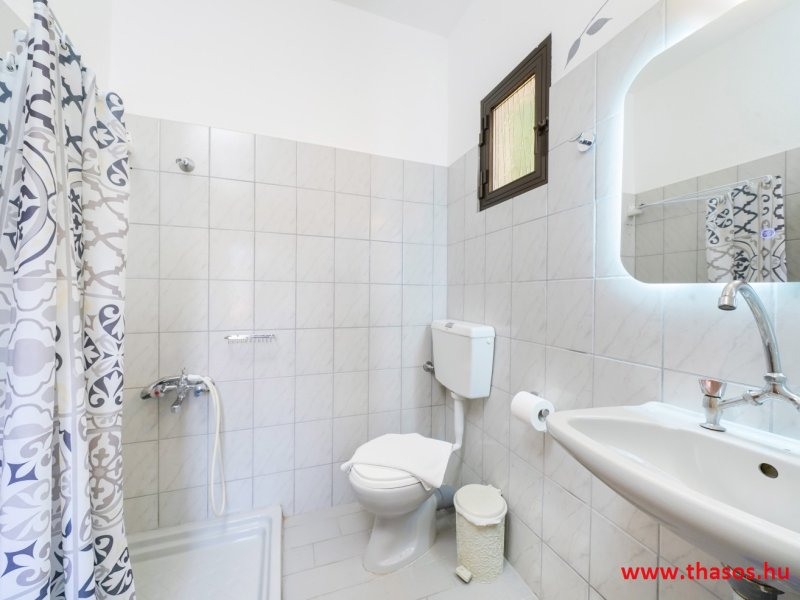 A/2. A stúdióba belépve ikerágy és a normál hálószobai berendezés van. Szükség esetén egy - egy kanapéágy elhelyezhető, bár a komfortosabb kényelem miatt, 2 személy részére ajánljuk. A konyharésze főzőfülke szerűen leválasztva az alvórésztől. A konyha normál méretű és berendezésű. A fürdőszoba zuhanytálcás tusfürdős. A lakáshoz a kertre és a tengerre néző nagy terasz tartozik.