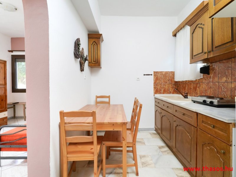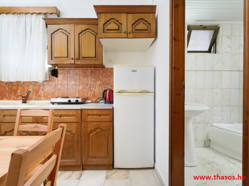 A/3. A stúdióba belépve ikerágy, egy kanapéágy, és a normál hálószobai berendezés van. A konyharésze főzőfülke szerűen leválasztva az alvórésztől. A konyha normál méretű és berendezésű. A főzőlap kétlapos villanyrezsó. A fürdőszoba zuhanytálcás tusfürdős. A lakáshoz a kertre és a tengerre néző nagy terasz tartozik.