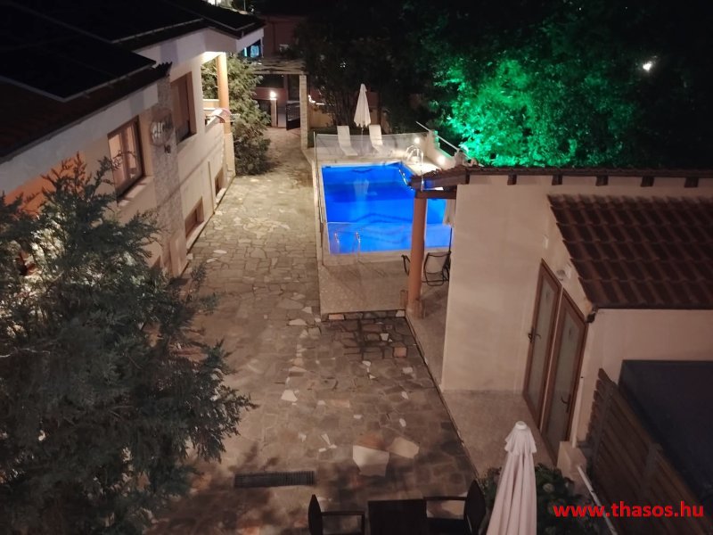 A medence az udvar belső kertjében 3,5m×8,5m nagyságú, 0,70-2,70m mélységű. A bár felőli medencebejáró a gyermekek részére 70 cm-es mélységű és kapaszkodó korláttal ellátott. Ahol a kapaszkodó korlát véget ér, ott kezd mélyülni a medence. A medence oldalán a fokozatos mélyülés számokkal megjelölve olvasható. Nem engedélyezett a medencébe való beugrálás. Este 21.00 órától fedve van, így az éjszakai fürdõzés sem lehetséges. A medence használata kizárólagosan a ház saját vendégei részére engedélyezett.