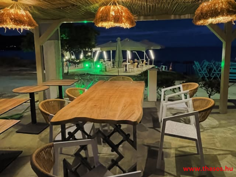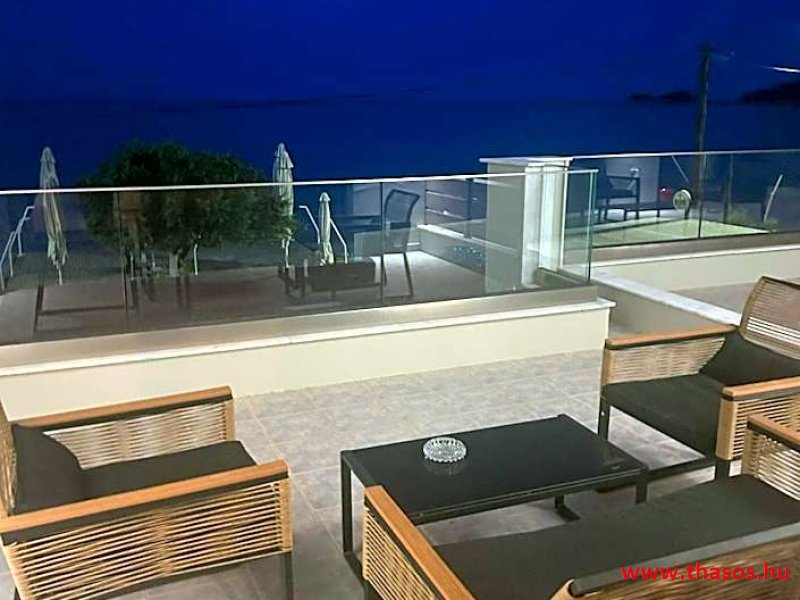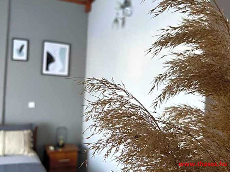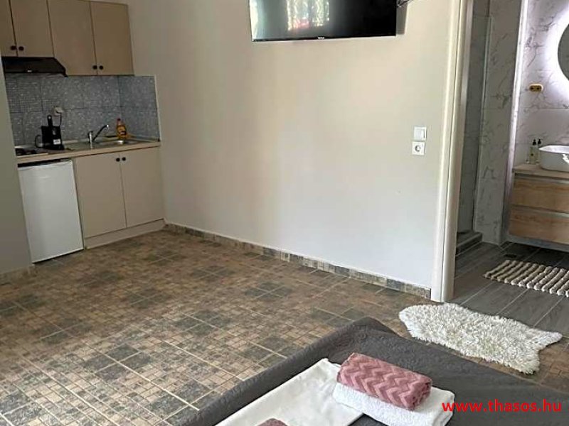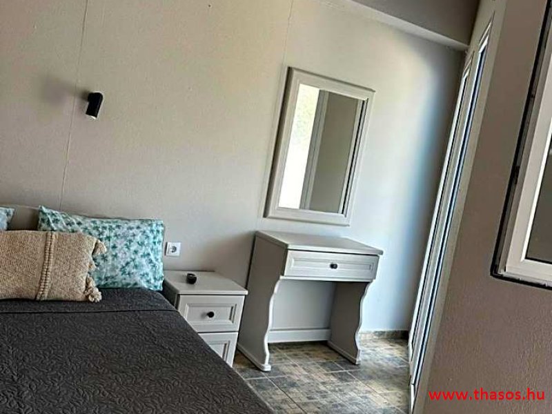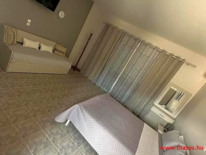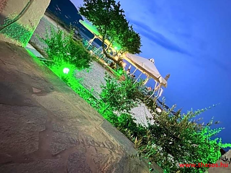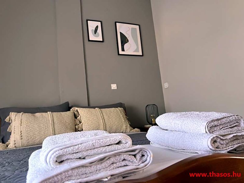 Elhelyezkedése a "Nagy strand" déli részén. Strandja elegáns, napágyakkal ellátott, széles fövényű. A strand homokos fövényének szélessége és az ott elhelyezett bérelhető napágyak mellett kényelmesen elférnek azok is, akik a saját napsátrukat szeretnék ott felállítani. A víz a szállás előtt sekély és áramlatmentes. Kisgyermekesek részére is kiváló. A szállás előterében a napközbeni strandolók ellátására szolgáló csendes kávézó és fagyizó bár várja a partról felsétáló vendégeket. A szállás vendégeinek a teraszról sincs teljes rálátása e bár-részre. A pihenés a nap és éjjel teljes szakaszban tökéletesen biztosított. Azon vendégeknek, akik esetleg reggeli vagy napközbeni taverna jelleget, snack-ellátást kérnek a lakásukba, erre van módjuk. Erre előfizetés nincs. Ennek részletes megbeszélése és kérése, ott helyben történhet. Felszerelése: Minden lakásban a normál konyhai tartozékok vannak. Közepes méretű, fagyasztórésszel ellátott hűtőszekrény, kétlapos villanyrezsó. Edények és kiegészítők szintén alap ellátásban. Kiegészítőként rendelkezik a konyha holland kávé- és teafőzővel. A kotyogót te hozd magaddal. Konyhai kiegészítőket is, ha nagyobb főzést szeretnél nyaralás alatt. A lakások fürdőszobái zuhanytálcásak és tolóajtós zuhanyzó ajtóval ellátottak. A lakások berendezéséhez tartozik a Tv és a légkondicionáló berendezés. A két apartman mindkét helyiségében külön légkondicionáló berendezéssel rendelkezik. Összességében kényelmes nagy lakások, hangulatos, szép kilátású teraszokkal. Nagyon igényes, ízléses a berendezése. EMELET N.2: 2+2 ágyas emeleti apartman 2015 -ös évben lett átadva. Egy hálószobás, 4 főre kényelmes. gyermek ágy elhelyezése lehetséges. Mind kettő helyiségerendelkezik légkondicionáló berendezéssel. Kettő terasszal rendelkezik. Pazar kilátással keletre, hol a tengerből kell fel a nap. De ugyan igy szeretik vendégei az északi, bejárat felőli hegyi kilátású teraszát is. A N1 studió és N2 apartman szomszédosak. Terasz elválasztó fal, nem létezik. Emiatt ajánlom baráti családoknak. Egyéb esetben a terasz választófal nélkülisége zavaró lehet. N. 1: 2+2 ágyas emeleti stúdió,- egy árnyalattal kisebb a szomszédos N:2-es lakásnál. Kettő normál ággyal és egy nagyméretű kinyitható kanapéággyal rendelkezik. FÖLDSZINT N. 3:. 2+2 +2 ágyas közepes teraszú, egy külön hálószobás apartman típusú lakás. A hálószoba franciaággyal, a nappali kettő személyes kinyitható kanapéággyal rendelkezik, akár négy közepes korú gyermek számára megfelelő mérettel. Terasza oldalsó fekvésben néz a tengerre, gyönyörű tengeri és hegyi kilátású, bár nem látszik a teljes 3 km-es öböl, csak a közepétől a déli csücskéig. N. 4. studió:. 2+2 ágyas Hatalmas méretű teraszú. Egy légterű studió lakás Francia ágy és kettő gyermek részére kinyitható kanapé ágyl. Bár oldal fekvésben van a tengerre, még is gyönyörű panoráma élvezhető a teraszról. A hegyre is azonos szép panoráma onnan. Baba ággyal pótágyazható. Reggelizési lehetőség: 14 Euró/fő/ nap/felnőtt - 2 éves korig ingyenes - 2-8 éves korig 7 Euró/fő/nap Képek a szállásról