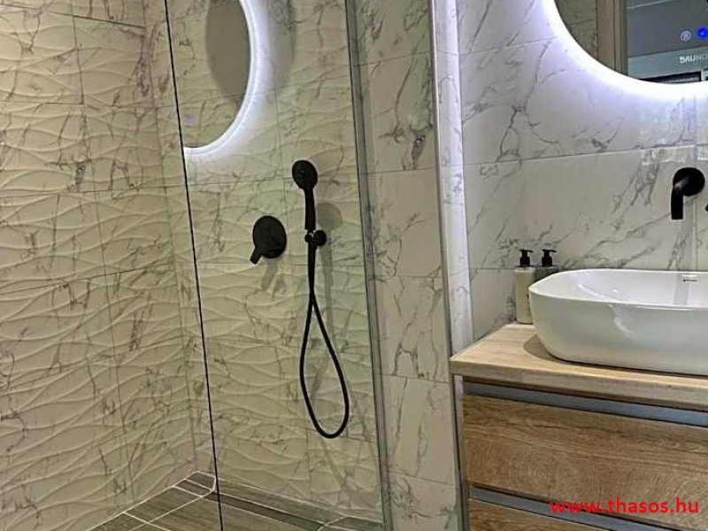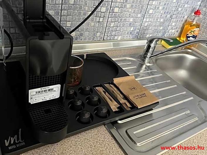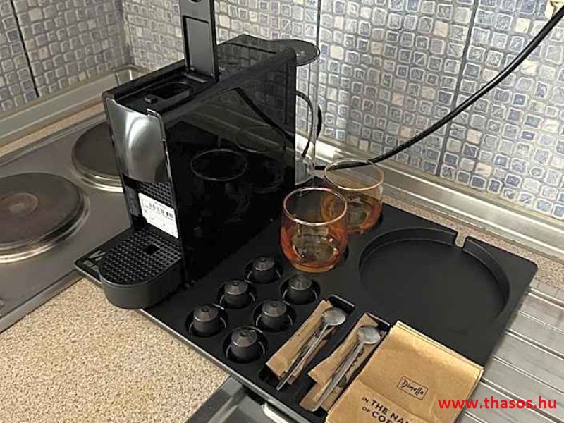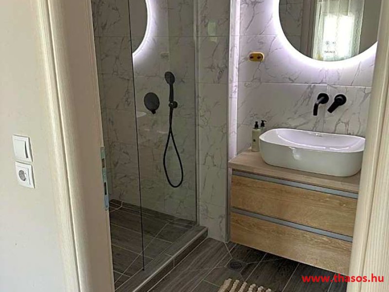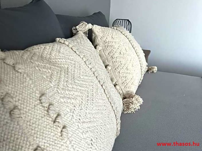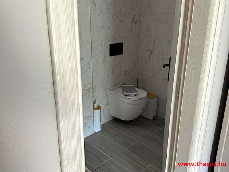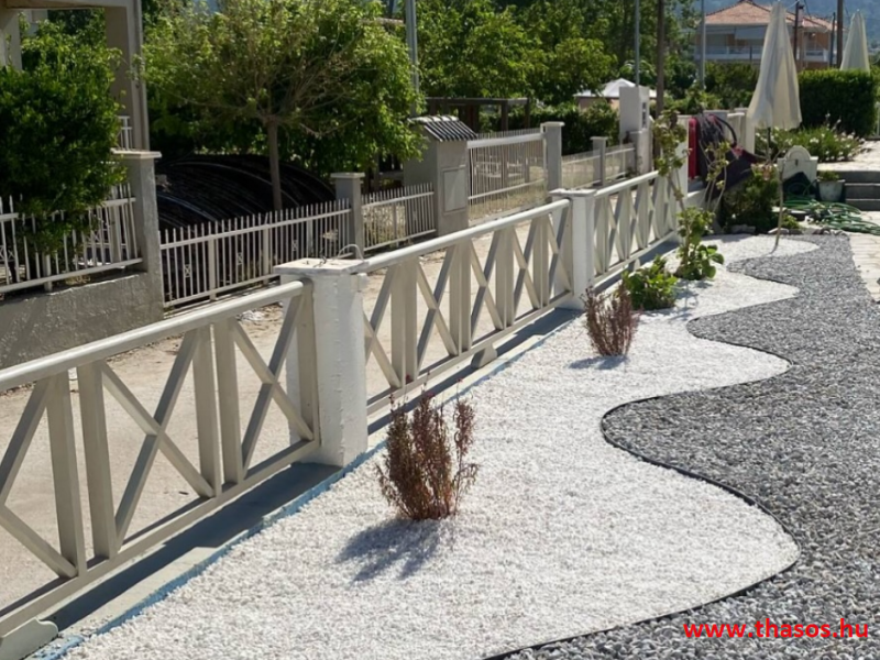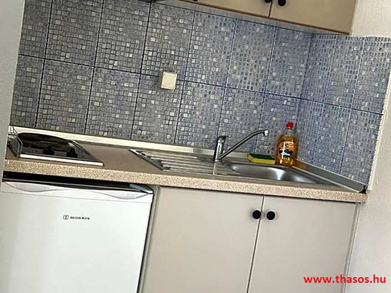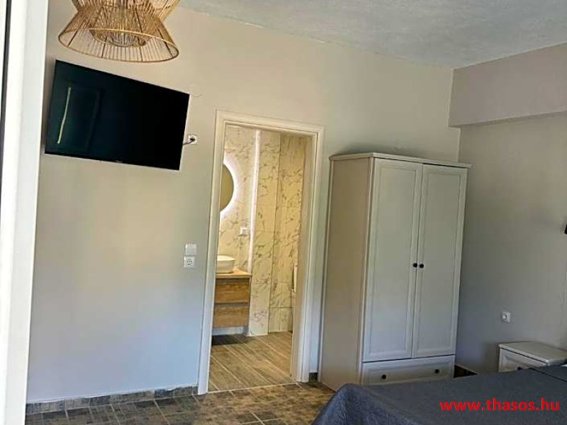 Elhelyezkedése a "Nagy strand" déli részén. Strandja elegáns, napágyakkal ellátott, széles fövényű. A strand homokos fövényének szélessége és az ott elhelyezett bérelhető napágyak mellett kényelmesen elférnek azok is, akik a saját napsátrukat szeretnék ott felállítani. A víz a szállás előtt sekély és áramlatmentes. Kisgyermekesek részére is kiváló. A szállás előterében a napközbeni strandolók ellátására szolgáló csendes kávézó és fagyizó bár várja a partról felsétáló vendégeket. A szállás vendégeinek a teraszról sincs teljes rálátása e bár-részre. A pihenés a nap és éjjel teljes szakaszban tökéletesen biztosított. Azon vendégeknek, akik esetleg reggeli vagy napközbeni taverna jelleget, snack-ellátást kérnek a lakásukba, erre van módjuk. Erre előfizetés nincs. Ennek részletes megbeszélése és kérése, ott helyben történhet. Felszerelése: Minden lakásban a normál konyhai tartozékok vannak. Közepes méretű, fagyasztórésszel ellátott hűtőszekrény, kétlapos villanyrezsó. Edények és kiegészítők szintén alap ellátásban. Kiegészítőként rendelkezik a konyha holland kávé- és teafőzővel. A kotyogót te hozd magaddal. Konyhai kiegészítőket is, ha nagyobb főzést szeretnél nyaralás alatt. A lakások fürdőszobái zuhanytálcásak és tolóajtós zuhanyzó ajtóval ellátottak. A lakások berendezéséhez tartozik a Tv és a légkondicionáló berendezés. A két apartman mindkét helyiségében külön légkondicionáló berendezéssel rendelkezik. Összességében kényelmes nagy lakások, hangulatos, szép kilátású teraszokkal. Nagyon igényes, ízléses a berendezése. EMELET N.2: 2+2 ágyas emeleti apartman 2015 -ös évben lett átadva. Egy hálószobás, 4 főre kényelmes. gyermek ágy elhelyezése lehetséges. Mind kettő helyiségerendelkezik légkondicionáló berendezéssel. Kettő terasszal rendelkezik. Pazar kilátással keletre, hol a tengerből kell fel a nap. De ugyan igy szeretik vendégei az északi, bejárat felőli hegyi kilátású teraszát is. A N1 studió és N2 apartman szomszédosak. Terasz elválasztó fal, nem létezik. Emiatt ajánlom baráti családoknak. Egyéb esetben a terasz választófal nélkülisége zavaró lehet. N. 1: 2+2 ágyas emeleti stúdió,- egy árnyalattal kisebb a szomszédos N:2-es lakásnál. Kettő normál ággyal és egy nagyméretű kinyitható kanapéággyal rendelkezik. FÖLDSZINT N. 3:. 2+2 +2 ágyas közepes teraszú, egy külön hálószobás apartman típusú lakás. A hálószoba franciaággyal, a nappali kettő személyes kinyitható kanapéággyal rendelkezik, akár négy közepes korú gyermek számára megfelelő mérettel. Terasza oldalsó fekvésben néz a tengerre, gyönyörű tengeri és hegyi kilátású, bár nem látszik a teljes 3 km-es öböl, csak a közepétől a déli csücskéig. N. 4. studió:. 2+2 ágyas Hatalmas méretű teraszú. Egy légterű studió lakás Francia ágy és kettő gyermek részére kinyitható kanapé ágyl. Bár oldal fekvésben van a tengerre, még is gyönyörű panoráma élvezhető a teraszról. A hegyre is azonos szép panoráma onnan. Baba ággyal pótágyazható. Reggelizési lehetőség: 14 Euró/fő/ nap/felnőtt - 2 éves korig ingyenes - 2-8 éves korig 7 Euró/fő/nap Képek a szállásról