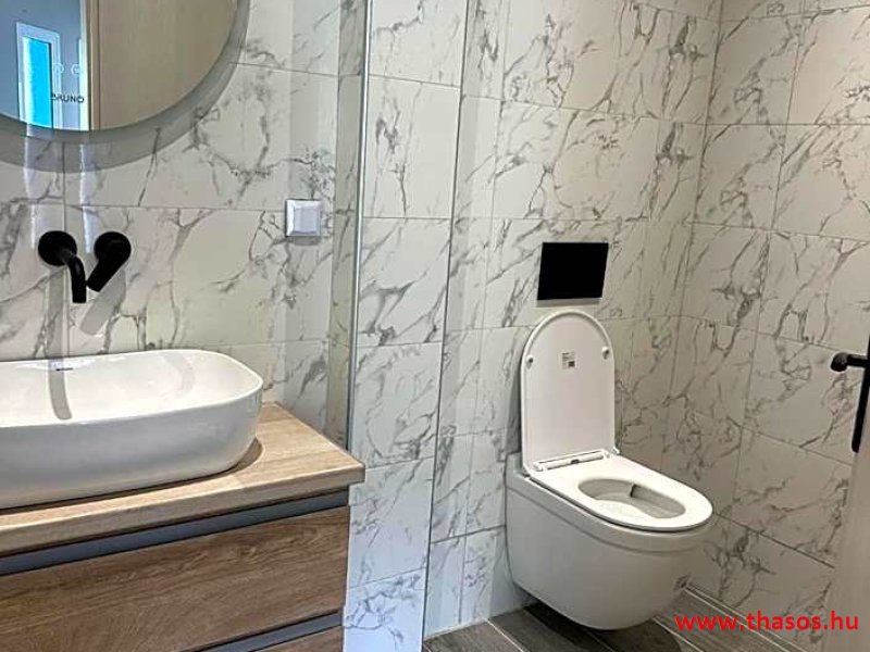 A lakásnak úgy az északkeleti fekvésű, hegyre néző hatalmas terasza, mint a délkeletre néző teljes tengerfrontú hatalmas erkélye közös.