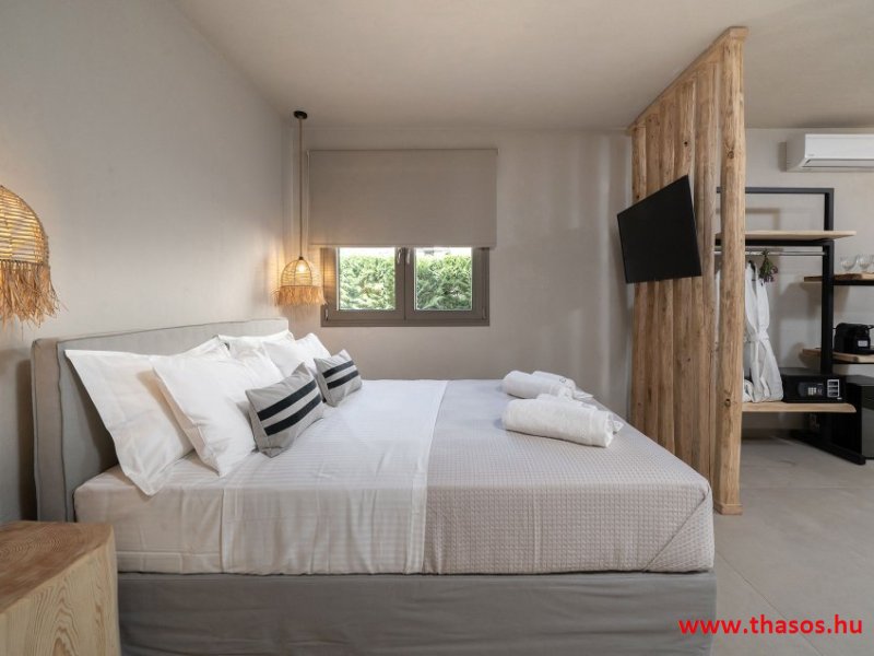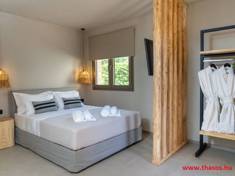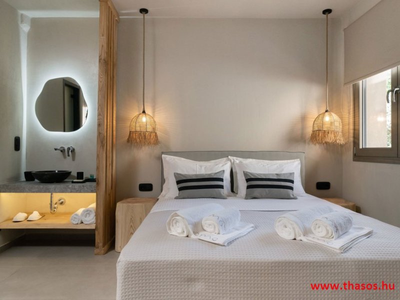 Az újonnan épült Arany homok hotel, mindössze néhány méterre a Golden Beach arany homokjától az öböl közepén. Tökéletes összhangban épült a nyers természeti szépséggel Thassos szigetének Arany part öble közepén, mely a Natura 2000 európai ökológiai természetvédelmi területén. A luxus egy másfajta értelmezését javasoljuk, amelynek semmi köze a lenyűgöző elemekhez, csak a természet adta szépséghez, magas komforttal tartózkodás első percétől az utolsó percig kínál élményeket. 10 stílusos lakosztály, mindegyik modern esztétikával, mediterrán napsütésben az Égei tenger adta csodás látványával. Az épület rendszer helyzete a parti strandfövénybe beépülve. Természetes szépségét a kő és a fa elegáns kombinációja fokozza, békés és harmonikus légkört teremtve, amely tökéletesen beleolvad a környező tájba mely az Ypszarió fenyves hegyvonulata és a homok buckás tenger. A medencéi, mint a tenger folytatása a lakásokhoz hozzáépülve. A lakás belsők bútorzatai, és minden eleme mind az épületet mellett folyó patak, tenger és a hegy ölelése tökéletes mediterrán hangulattal. 10 elegáns lakosztály földes hangulattal és bohém bájjal, amelyek készen állnak arra, hogy egyedi és felejthetetlen élményeket kínáljanak Önnek. Az Arany homok hotel öt különböző kategóriájú lakosztállyal és egy egyedi esztétikai megjelenésű közös úszómedencével rendelkezik, amely modern kényelmi és szolgáltatási lehetőségek széles skáláját kínálja, lehetőséget adva az ügyfél igényeinek megfelelő választásra. Szolgáltatás: Hideaway -Lakosztályok kertre néző kilátással Éden lakosztályok tengerre néző kilátással Natura lakosztályok Natura lakosztályok tengerre néző kilátással Sunrise lakosztályok/tengerre néző - saját magán medencével Apartman ár: 4 fõre Időszaktól függően változó, Május 20-tól - Október közepéig: 150-550 Euró. Reggeli szolgáltatás 15 Euró/fő/nap/ extra költség. Kérem érdeklődjön. Képek a szállásról Hideaway -Lakosztályok kertre néző kilátással Éden lakosztályok tengerre néző kilátással Natura lakosztályok Natura lakosztályok tengerre néző kilátással Sunrise lakosztályok/tengerre néző - saját magán medencével Képek az öbölről