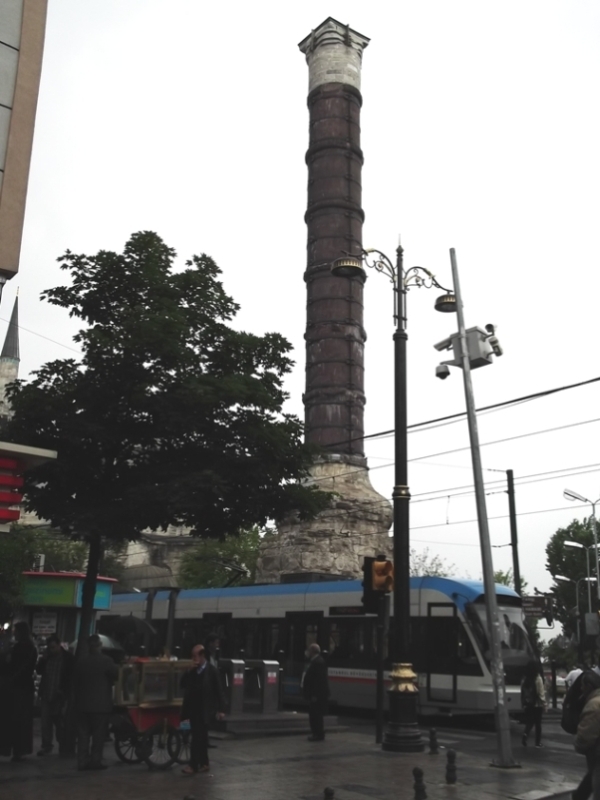 Szóval a Çemberlitaş-oszlopnál értünk a fő ütőérre, ahol a villamos is jár. Ezt az oszlopot Nagy Konstantin állította, de ezt is Rómából hozta ide… az alapjában állítólag volt valami ereklye, amit Aeneas Trójából hozott… Konstantin meg tetetett bele keresztény ereklyéket, Krisztus keresztfájának egy darabját… ennek ellenére az oszlop tetején az ő szobra volt… egy ideig. Ez a hely volt a római kori város Fóruma. Itt viszonylag vízszintes a terep. Az oszloppal aztán valami történt, már nem sokkal a fölállítása után össze kellett drótozni, azóta is úgy van, csak egyre jobban összeabroncsozva, ezért hívják Abroncsos oszlopnak.