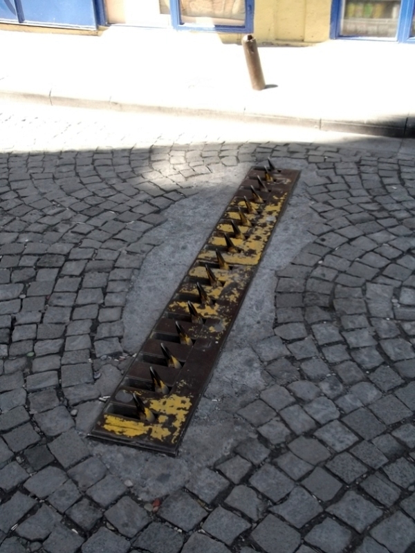 Ezen a napon, miután kifújtuk magunkat a kopasz oszlop tövében, nem mentünk keresztül a Hyppodromon, hanem tovább egyenesen a Çemberlitaş felé. Az is szűk utca. Hol nem esett, hol esett. Egy esernyőnk volt, de túl szűk volt a járda. Meg hepehupás a város… itt is fölfelé mentünk. Itt tudatosult az élmény – a helyi árusok mindent árulnak, de mikor megjelennek a felhők és leérkezik két-három csöpp eső, az összes árus hirtelen esernyővel rohangál, és ordít, hogy ámbrella-rella-rella-rella… Hogy hol tartják? de abban a pillanatban, ahogy szükség lesz rá, rögtön előkerül az árukészlet. Az isztambuli turistaesernyő átlátszó fólia, a szilárd részei meg élénk színű műanyagból vannak. Vettem egyet 5 líráért, haza is hoztuk