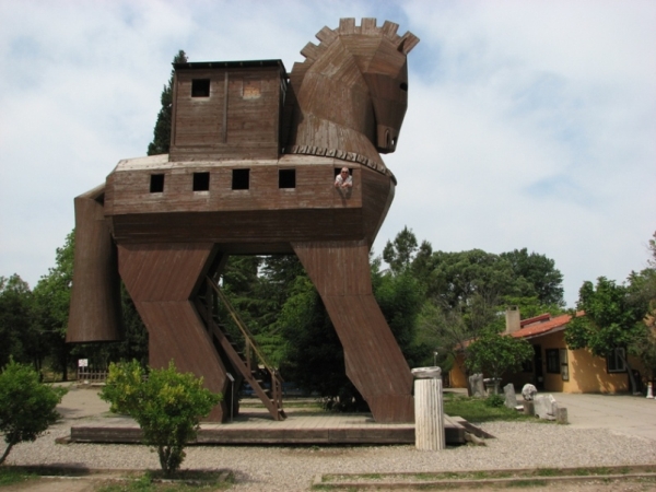 Visszaindultunk. Az út minősége miatt nem újabb falvak között, hanem amerről jöttünk. Úgy terveztük, hogy Çanakkale kikötőjében majd a másik mólóhoz állunk, és a Kilitbahirhoz menő kompra szállunk föl, megnézzük majd a várat meg kicsit tovább a félsziget végét. De a főút csapása a nagy komphoz tereli az embert, nem is láttuk, hogyan lehetett volna a másik mólóhoz menni. Itt viszont nagyüzemben dolgozzák föl az utazóközönséget, pillanatok alatt rajta voltunk az Eceabatba menő hajón. Hát… nem baj. Úgyis elfáradtunk… egye fene, ne menjünk tovább csavarogni. Amikor a hajó elhagyta a partot, visszanéztünk, hogy legalább messziről nézzük meg a filmbeli falovat. Ott ágaskodik a parti sétányon.