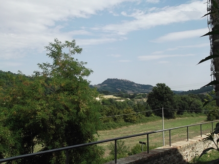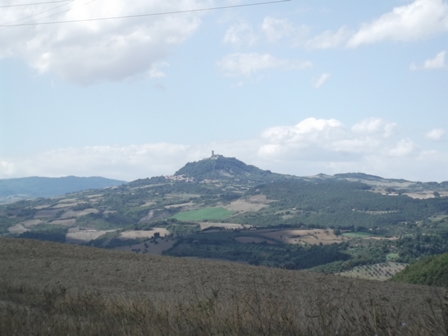Cattolicától délre a tengerparton van egy kis hegy, Monte San Bartolo. Olyan kicsi, hogy semmiféle leírás nem említi. De az idei Giro d’Italia bicikliversenyen megmászták a versenyzők, akkor csodálkoztam rá, hogy panorámaút meg néhány tündéri kis település van ott. Nosza beleterveztem az útvonalba. De az autópályáról lehajtva a navigációs készülék begerjedt és megvadult (vagy én voltam figyelmetlen?). Csak mikor az a dög elkezd nekem rikácsolni, hogy fordulj vissza! fordulj vissza! , akkor elvesztem a fejemet. Hely nem volt megállni, türelmem nem volt kibogozni, viszont ezersok fok volt a hőmérséklet… a környék térképét trehány módon nem nyomtattam ki… Sajnáljuk a kimaradt szakaszt, de van az a pont, amikor az ember már csak megérkezni akar