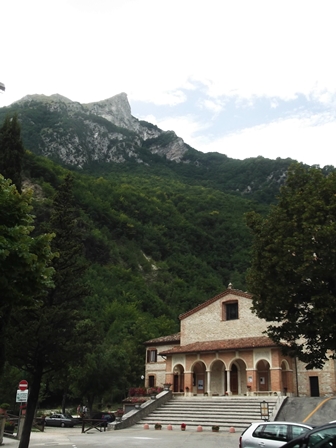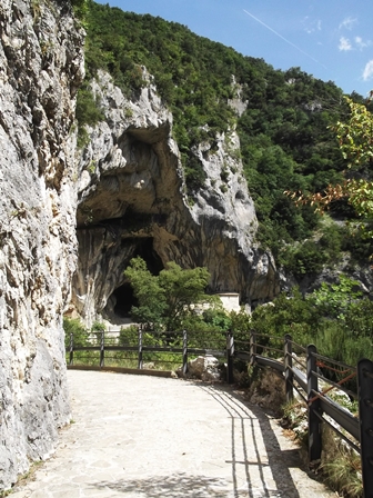A Frasassi-szurdokban tovább haladva – mintha mindjárt összecsapnának fölöttünk a sziklafalak – van parkoló ott, ahol a Madonna di Frasassi kápolnájához indul föl a keresztút. A stációk számozásából látszik, mennyire lehetünk még a kápolnától De amúgyis lefoglal a meredek sziklafalak, a lent kanyargó folyó meg a partján vezető út látványa.