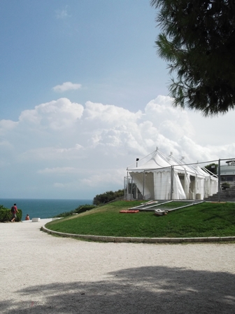 Innen irány Ancona. Megtaláltuk az első világháborús katonai emlékművet, ez felkapott kilátóhely, mert komoly mellvéd húzódik előtte a part felett. Az emlékművet tatarozzák, előtte sátrak voltak felállítva, minden bizonnyal a vasárnapi vitorlásverseny tribünje készült.