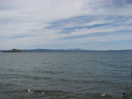 Mentünk tovább, majd a Trasimeno-tó felé kerültünk. A tó déli oldalán van egy jó kis pihenőhely, padokkal. Sokan meg-megálltak itt nézelődni… de nekünk sikerült árnyékban hagyni az autót és az árnyékban álló padot is sikerült megcsípni. Pihentünk, falatoztunk, nézelődtünk. Szép a tó látványa. Komp is jár a szigetre. Ott messze, szemben, az északi oldalon zajlott le a csata, ahol Hannibál megverte a római sereget.