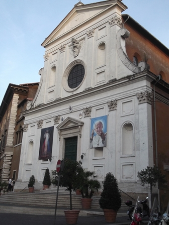 Innen nem az egyenes sugárúton, hanem a Borgo eredeti kis utcáján mentünk tovább. A Santo Spirito in Sassia kórház épülettömbjében a templom a krakkói eredetű Isteni Irgalmasság tisztelet római temploma. Az egyik mellékoltár van erre kialakítva a „Jézus, bízom benned” képpel. Itt van a rituálét látomásaival elindító Fausztina nővér ereklyéje is. Éppen mise volt… szerencsére éppen megmozdultak a hívek az áldozás miatt.