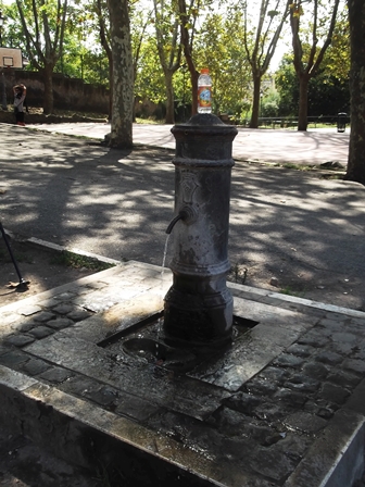 Visszakaptattam, majd a másik oldalon – ahol a farkasszobor áll – mentem le a kerítéshez a Fórumot nézegetni. Itt van egy ivókút is, ez a leghidegebb az összes közt, ahol jártam. Oldalt van egy kisebb teraszféle, ahonnan a császári fórumok látszanak.