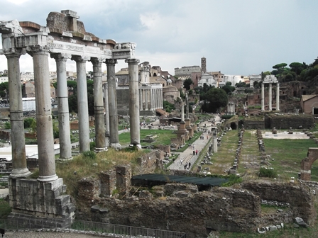 Először lementem a Palazzo Senatorio mellett jobbra. Néztem a Forum Romanum területét, néztem a Palatinus dombját. Szemben a Palatinus egy kiépített teraszán pont a szemembe tűzött, hogy ott a kerítésnél fürtökben zsúfolódnak az emberek. Engem a konkrét romok helyett inkább az érdekelt, valójában mekkora ez a domb? Mert eleinte – Romulus és Remus korán túl persze – az előkelők laktak itt, de ahogy olvastam, nem kevesen, és hát egy úri ház a telekkel együtt azért szép területet elfoglalt, elfért itt elég sok ház? Hát… azt hiszem, el. Még akkor is, ha ma egyetlen császári palota romjai foglalják el az egész területet. Az eredeti dombok területéből, magasságából pedig a történelem folyamán elég sokat legyalultak a sok építkezés során.