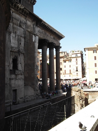 Tovább a Pantheon felé. Bár tudom, hogy az évszázadok során az utcák mennyit töltődtek fel, mégis meglepődtem, hogy a Pantheon oldala mennyire mélyen van – hiszen a fényképek mindig csak szemből mutatják. Tömeg kint is, bent is. Odabent középen azt kerestem, hogy tud lefolyni az esővíz, ha beesik a nyitott kupolán. Meg is találtam a padlóban a lyukakat, le is fényképeztem (erről soha sehol nincs fénykép).