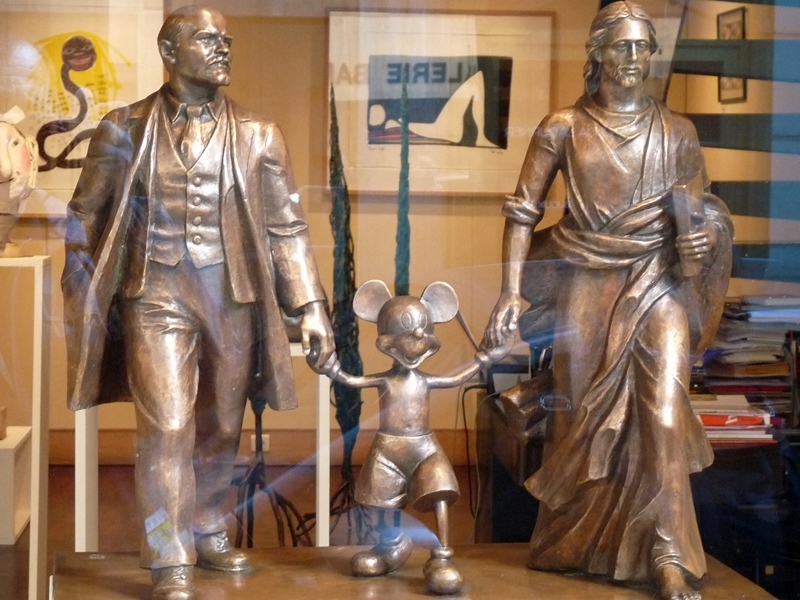 Ekkor már kukucskált a felhők mögül a nap. És elindultunk végig a Szajna mentén, megbámulva a festők és könyvárusok bazárjait. Egyik hídon át-, a másikon pedig vissza mentünk. Közben láttuk a csodálatos Nagy Palotát (Grand Palais), a Kis Palotát (Petit Palais), az Invalidusok Dómját, elmentünk a Musee D'Orsay mellett. Az Institut de France mellett letértünk egy kis utcába, amely galériák sorát rejtette. Na, itt aztán minden féle alkotást megcsodálhattunk. Az egymás kezét fogó Lenin-Mikiegér-Jézus szoborkombináció mellett nem tudtunk elmenni szó nélkül.