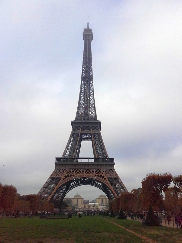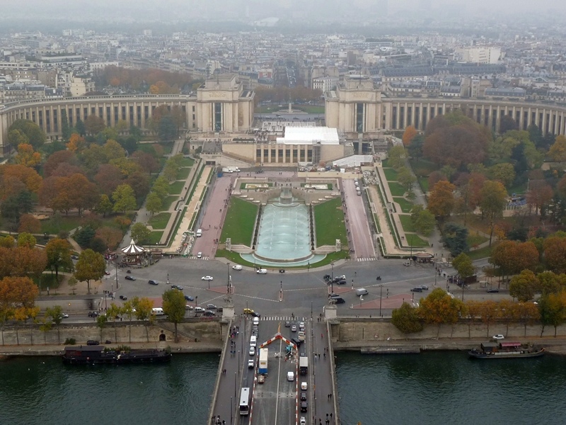 Másnap reggel nappali fényben is megnéztük. Azaz csak néztük volna, mert a köd rátelepedett Párizsra. Fél 10-től nyitottak a pénztárak, de már 9-kor hosszú sorok kígyóztak a torony lábánál. Szigorú és több szinten zajló biztonsági átvizsgálás után végre feljutottunk. Lifttel. Gyalogolhattunk volna, ha akarunk, de nem akartunk. Ahhoz azért piszok magas ez a torony. Hideg volt: kesztyű, sapka kellett. De gyönyörű a látvány. Körbejártuk a szinteket. Végül a 3., legmagasabb szintre nem mentünk fel, mert totálisan ködbe burkolózott, semmit nem lehetett volna látni. Inkább a 2 alsó szinten bámultuk a 9 milliós várost ill. azt, amit látni engedett a természet. Nehezen szakadtunk el a toronytól, de nem hagytuk teljesen magára, mert lentről, a Mars mezőről is tucatnyi fotót készítettünk.