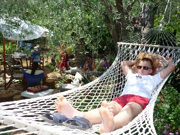 A két hétre igazán sok programot nem terveztünk, ez a nyaralás a láblógatásról, a strandolásról és a spórolásról szólt. Ezekből az első kettő megvalósult, az utolsó nem annyira. De hát nem tudtunk ellenállni a jobbnál jobb tavernák hívogatásának. :)Az első nem fürdős napon Ágiék meghivására ellátogattunk a kertjükbe. A program bográcsozás és beszélgetés volt. A kert lehetne egy vár is, mert minden kőből épült, a kerítés, a falak, a medence, .... De most legalább már tudom, hogy hova kell az a sok-sok kő, amit a kirándulásokon összeszed. :D A kert minden m2-e hasznosítva van. Mindent ültettek, amit elfogyasztanak. De a pihenésnek is van lehetősége, mert itt-ott 1-1 csincsola (függőágy) van felszerelve. Pános ott dolgozik mindig, mikor nem a hajón van. Na és persze Ági is, mikor nincs szezon. :) A bográcsos paprikáskrumpli nagyon jól sikerült, hála Ági testvérének. Még a szomszédok is átjöttek falatozni, nekik szintén nagyon ízlett a magyaros íz. :) Ebéd után Gergőt (és engem) Ági és Pános megtanított "táblizni" (Backgammon), tudjátok, amit a kávézókban játszanak a férfiak. (Azóta itthon is rendszeresen játsszuk az Ágiéktól kapott játékon.) Ez a nap kellemes pihenéssel telt el.
