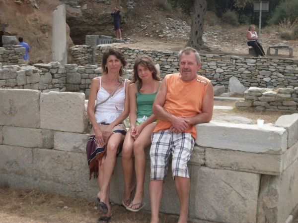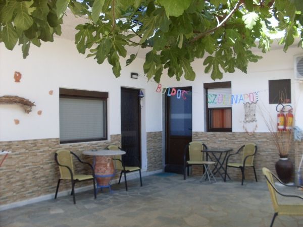 Végre Scala Potamia, betoppantunk a szállásra. Szegény Efiék éppen sziesztáztak, én meg kirobbantottam őket. Minden elismerésem az övék, mert pillanatok alatt hoztak gyümölcsöt, kávét, sört. A nagy fügefa alatt beszélgetni kezdtünk, 3 féle nyelven. Mi is megkínáltuk őket egy kis hazai ezzel-azzal.